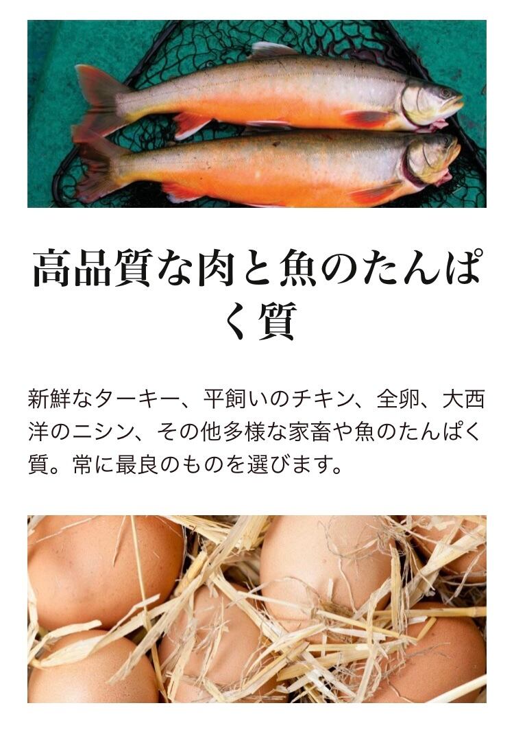 カナダ沖の新鮮な魚(一部チキン使用)、GI値の低い全粒穀物、栄養豊富な野菜と果物を使い、衛生管理された工場で作られたドッグフードです。